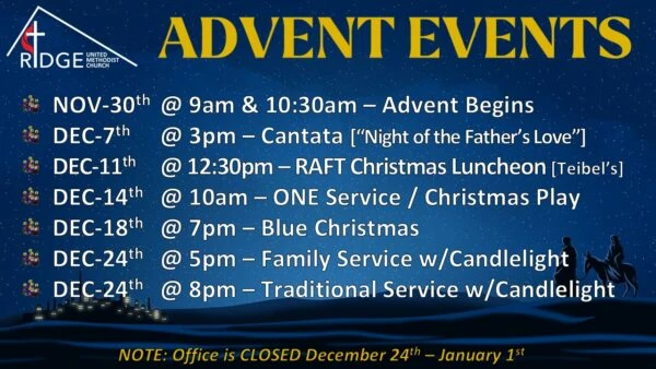 As members of Ridge United Methodist Church we are united with Jesus Christ in His ministry of compassion for all people by offering Hope, Unconditional Love, and Meaning For Life.
